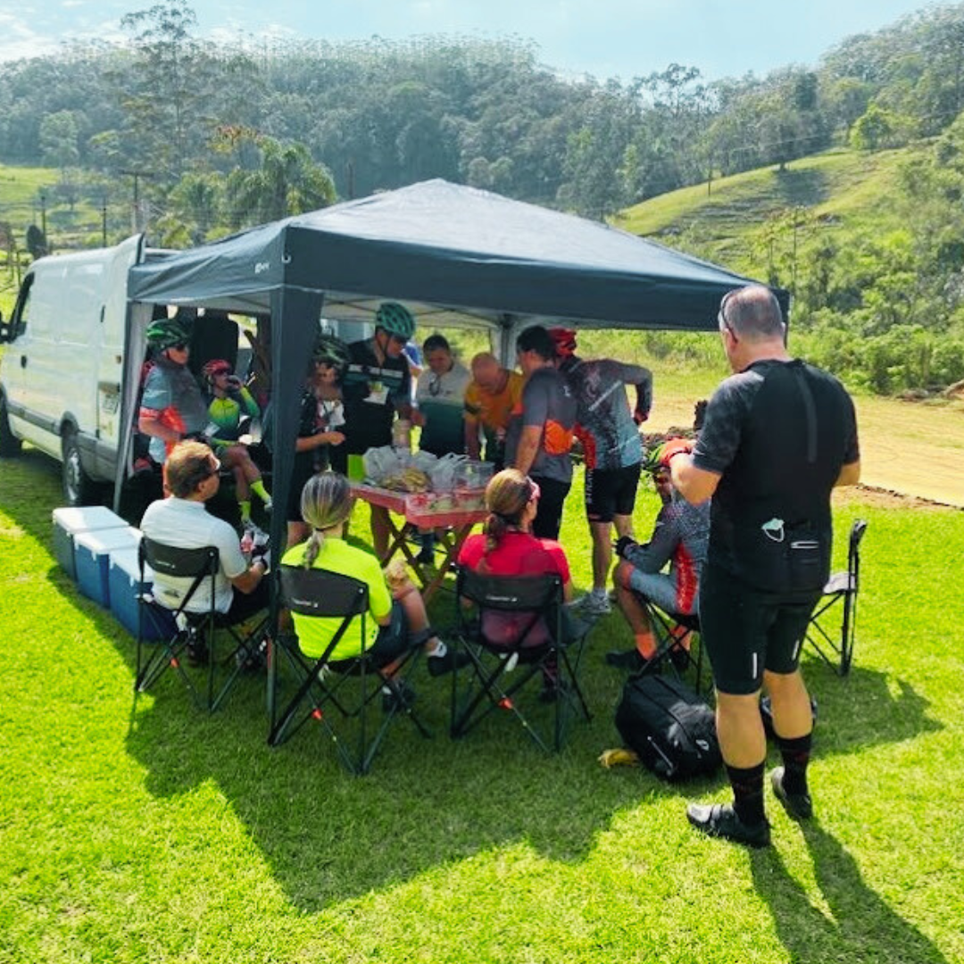 Nosso carro de apoio conta com uma estrutura diferenciada, tenda para dias de sol e chuva, cadeiras, hidratação completa (água, isotônicos, coca-cola, energético, café…), e alimentação (lanches frescos, queijo colonial, linguiça Blumenau, paçoca, bananinha e frutas)